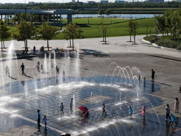 初秋的花园里,阳光微暖、空气清新。鱼尾式喷泉成为孩子的乐园,他们或撑伞穿梭,或赤脚奔跑,笑声伴着水花回荡。草坪上,五彩帐篷星罗棋布,孩子们嬉戏、年轻人踢球;“红丝带”滨水步道上,骑行者追风而行;湖边,钓鱼爱好者静候渔获,叠水花园的潺潺流水与鸟鸣相映成趣。